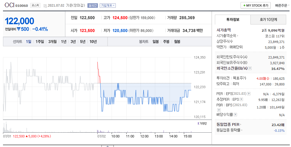 OCI 역시 효성 화학과 마찬가지로 저평가되어 있는 걸로 평가받으면서 주가가 상승하고 있습니다. OCI의 목표주가는 20만 원이라고 합니다. 관심 있으신 분들은 잘 알아보고 매수를 해도 좋을 것 같습니다.