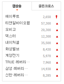 오늘은 네이버금융의 갭상승에 있는 에이루트와 티앤알바이오팹에 대해서 알아보았습니다. 에이루트는 무상증자 권리락으로 급등했고 티앤알바이오팹은 인공간을 제작하여 급등하였네요. 그러면 내일도 주식관련하여 포스팅을 이어서 해보겠습니다.