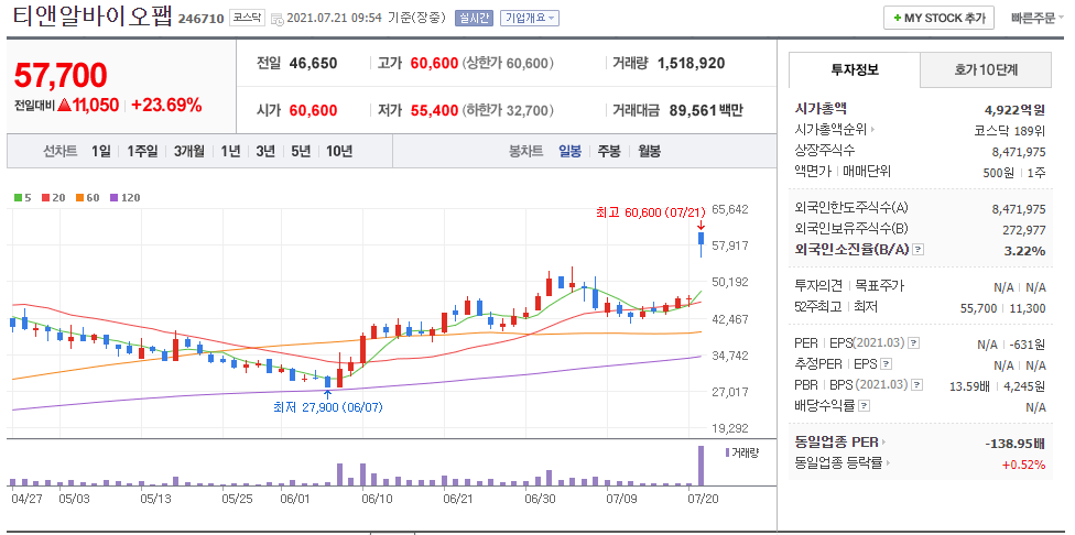 그러면 이번에는 2번째로 갭상승에 떠있는 티앤알바이오팹에 대해서 알아보겠습니다.