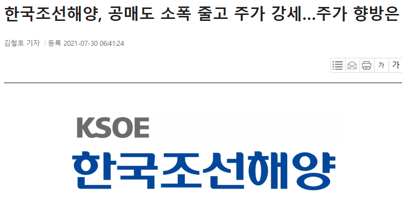 2일전 뉴스인데요. 한국조선해양, 공매도 소폭 줄고 주가 강세... 이런 뉴스이네요. 그러면 공매도의 뜻을 찾아보겠습니다.