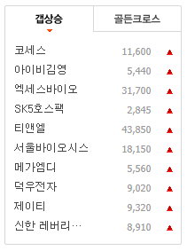 안녕하세요. 자기계발블로거입니다. 이제 큰 더위는 지난것같은 수요일입니다. 그래도 낮에는 30도 이상 기온이 오른다고 하니 건강 잘 챙기시고 오늘도 즐거운 하루 보내시길 바랍니다. 오늘도 어제에 이어서 네이버금융의 국내증시중 갭상승 종목에서 하나씩 알아보고 포스팅을 해보겠습니다. 지금 시간 기준으로 갭상승 종목은 아래와 같습니다. 그러면 제일위에 있는 코세스 부터 알아볼께요.