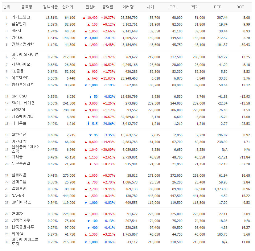 안녕하세요. 자기계발 블로거입니다. 오늘은 즐거운 금요일입니다. 여전히 날도 덥고 지치지만 기운내서 즐거운 하루 보내시길 바랍니다. 오늘은 카카오뱅크가 상장하는 날인데요. 그래서인지 네이버금융의 국내증시 인기검색종목을 보니 아래와 같이 카카오뱅크가 1위로 나오고 있습니다. 저도 카카오뱅크 공모주를 청약 받아서 5주 갖고 있었는데요. 오늘 아침에 바로 매도했습니다. 매도하고 나서 계속 오르니 좀 아깝긴 하네요. 아무튼 오늘은 인기검색종목중에서 알아보고 포스팅해보겠습니다.