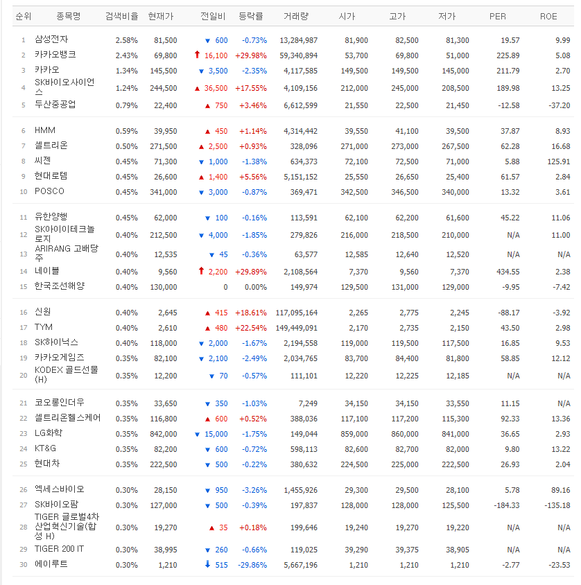 안녕하세요. 자기계발 블로거입니다. 오늘은 즐거운 토요일입니다. 여전히 후덥지근한 날인데 벌써 오늘이 입추라고 하네요. 이러다 금방 가을도 오고 또 금방 쌀쌀해질것 같습니다. 오늘은 토요일이니 더욱더 즐겁고 건강한 하루 보내시길 바랍니다. 오늘도 어제에 이어서 네이버금융의 국내증시에서 인기검색종목을 보고 종목들에 대해 알아보겠습니다.