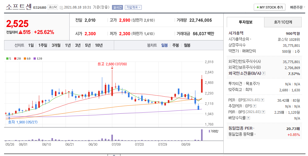 그러면 소프트센이 갭상승한 이유를 찾아보겠습니다.