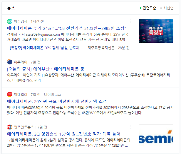 이런 뉴스들이 나옵니다. 지난 11일 에이티세미콘은 시가 하락에 따라 200억원 규모의 16회차 전환사채 전환가액을 3123원에서 2985원으로 조정한다고 공시했다고 하는데요. 조정 후 전환 가능 주식 수는 670만167주로 늘어난다고 합니다.