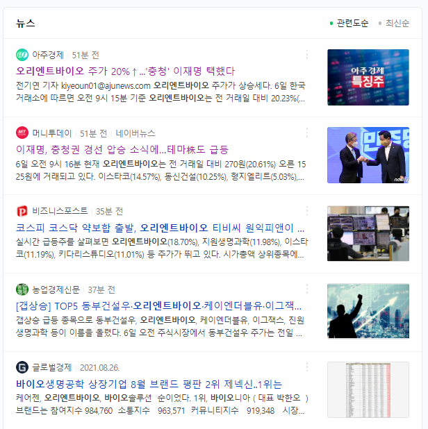 그러면 오리엔트바이오가 갭상승한 이유를 관련 뉴스를 찾아서 알아보겠습니다. 아래와 같은 뉴스들이 나오네요. 뉴스를 살펴보니 위의 오리엔탈정공과 마찬가지로 오리엔트바이오도 이재명 관련주라고 합니다. 오리엔트바이오는 이 지사의 오리엔트 시계공장 근무 경력과 2017년 오리엔트바이오 공장에서 진행한 대선 출정식을 진행했다는 이유로 관련주가 되었다고 합니다.