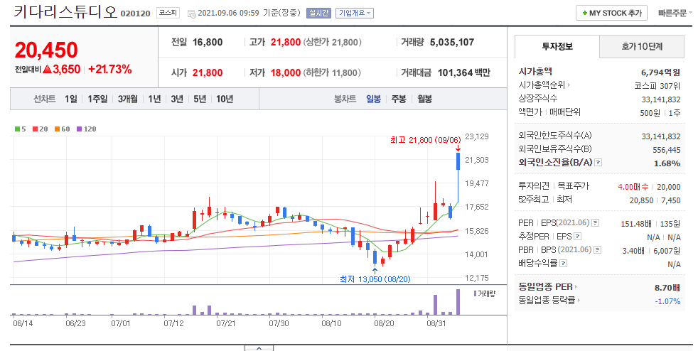 위의 이미지는 지금 시간 기준 네이버금융 국내증시의 갭상승 종목입니다. 동부건설우, 키다리스튜디오, 오리엔탈정공, 오리엔트바이오, 제룡산업, 케이엔더블유, 후성, 이그잭스, 진원생명과학, KCC가 나오네요. 이중에서 지금까지 포스팅안한 종목을 찾아서 하나하나 갭상승 이유를 찾아보겠습니다. 그럼 우선 키다리스튜디오부터 알아볼께요.