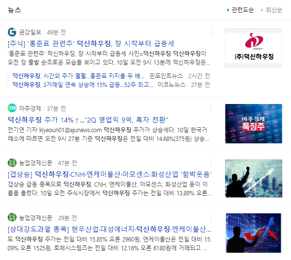그러면 덕신하우징이 갭상승한 이유를 관련 뉴스를 찾아서 알아보겠습니다. 아래와 같은 뉴스들이 나오네요. 2가지 관련 뉴스가 있는데요. 하나는 원자재 상승에 따른 단가인상을 실시하면서 영업이익이 흑자로 전환되었고 계절적 요인으로 건설업계 수요가 늘어나면서 매출액이 상승했다는 뉴스이구요. 다른 하나는 홍준표 의원이 부산 강서구 가덕도 신공항 부지를 방문해서 화물을 수송할 큰 비행기가 떠야 하는데 3500m 활주로는 짧다. 최소 3800mm는 돼야 한다고 밝히면서 홍준표 관련주로 거론되고 있다고 합니다.