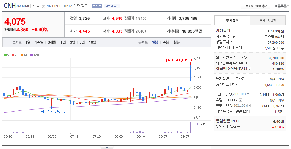 그러면 CNH가 갭상승한 이유를 관련 뉴스를 찾아서 알아보겠습니다. 아래와 같은 뉴스들이 나오네요. 뉴스를 살펴보니 CNH는 타회사의 주식취들을 통해 실질적인 지배권을 취득하는 것을 목적으로 하는 지주사업 및 시타 유가증권 취득 등의 투자업무를 주된 사업으로 영위하는 업체인데요. 기타금융 관련주들이 상승세라고 합니다. 또한 CNH는 지난해 연결기준 영업이익이 전년 대비 163.8% 증가했고 매출액도 84% 늘었고, 당기순이익도 119.3% 증가했다고 합니다.