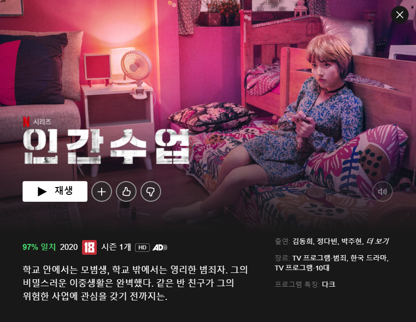 두번째 드라마도 우리나라 작품이네요. 다음은 인간수업입니다. 위의 무브투헤븐에 비해서는 좀 어두운 내용같아요. 내용은 돈을 벌기 위해 죄책감없이 범죄의 길을 선택한 고등학생들이 그로 인해 돌이킬 수 없이 혹독한 대가를 치르는 과정을 그린 넷플릭스 오리지널 시리즈입니다.