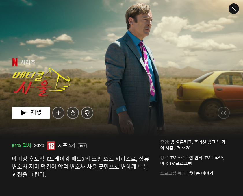 다음으로 소개해 드릴 넷플릭스 오리지널 드라마는 베터콜 사울입니다. 시즌5까지 나와있는것보니 꽤 재미있을것 같아요. '브레이킹 배드'의 스핀오프로 변호사 사울 굿맨의 이야기라고 합니다. 한번보면 시즌 끝까지 쭉 보게된다고 하네요. 이것도 다음에 꼭 봐야겠습니다.