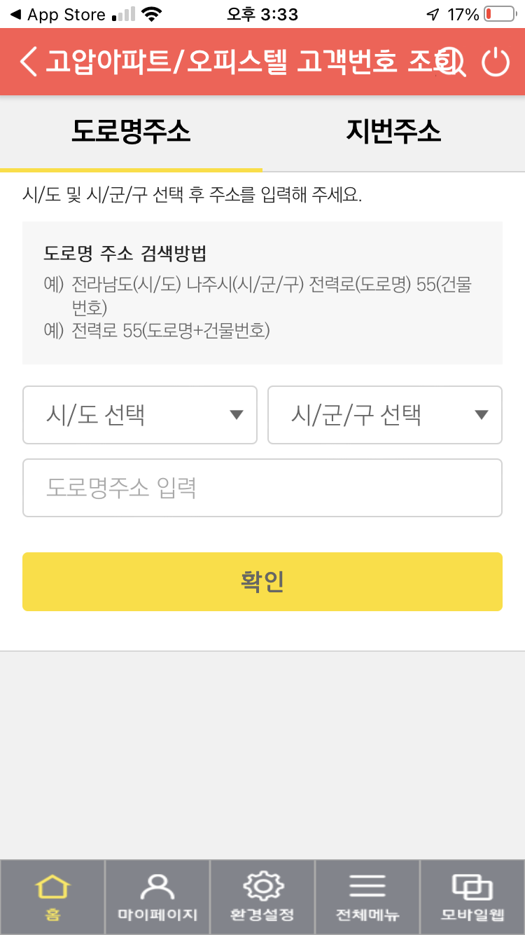 그러면 일반 고객번호 찾기, 아파트 고객번호 찾기가 나옵니다. 대부분의 아파트는 개별 고객번호가 부여되지 않고 해당 아파트 전체가 같은 번호로 되어 있어서 이렇게 나뉘어서 나온다고 해요.
