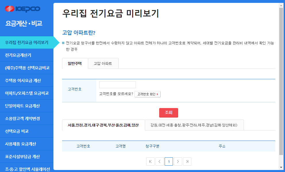 클릭해보시면 아래와 같은 화면이 나오는데요. 일반주택과 고압 아파트로 나뉘어서 확인할 수 있습니다. 고압아파트란 위에서 설명드린데로 아파트 전체가 하나의 고객번호로 계약되어 세대별로 고객번호가 따로 나오지 않는 경우를 말해요. 이 화면에서 위에서 검색한 고객번호를 입력하고 조회해보시면 됩니다. 이 때 현재 계량기값을 입력하라고 나오는데요. 우리집 계량기를 보고 계량기값을 입력해주시면 됩니다.
