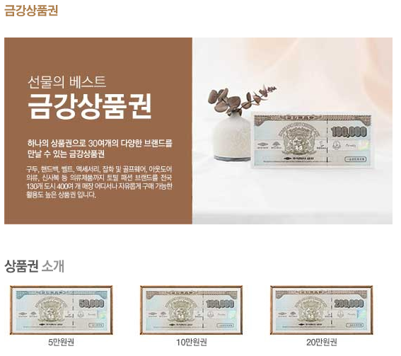 금강제화 상품권은 총 6가지로 5만원권, 10만원권, 15만원권, 20만원권, 30만원권, 50만원권으로 발행됩니다.