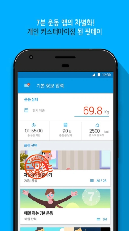 기본 프로그램은 '근력&유산소 운동'과 '스트레칭 운동'으로 나뉘어 있고, 근력/유산소 운동으로는 '저질 체력 탈출하기', '매일 하는 7분 운동' , '이틀 전환 7분 운동' , '뱃살 제거 다이어트' , '탄력 있는 힙과 허벅지 만들기' , '식스팩을 위한 도전' , '고강도 체력 증강 훈련' 이 있고요.