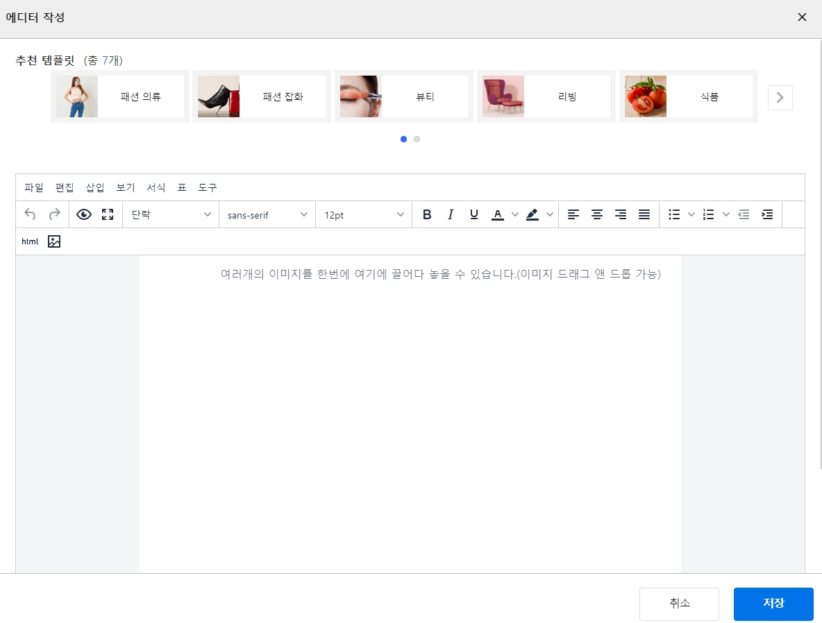 - 에디터 작성으로 들어오시면 이런 화면이 나옵니다. 쿠팡에서 제공하는 추천 템플릿을 이용하시면 제목+내용 사진 등이 적당하게 배치된 기본 템플릿이 나오니 거기에서 글과 사진을 수정하여 입력하시면 편하고 보기에도 깔끔합니다.