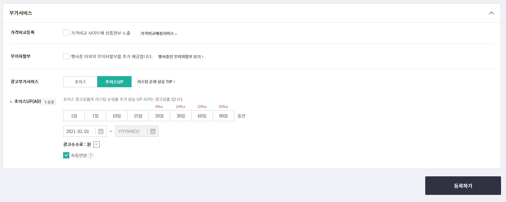 - 그 외 광고 등을 설정하시고 등록하기를 누르시면 완료입니다.