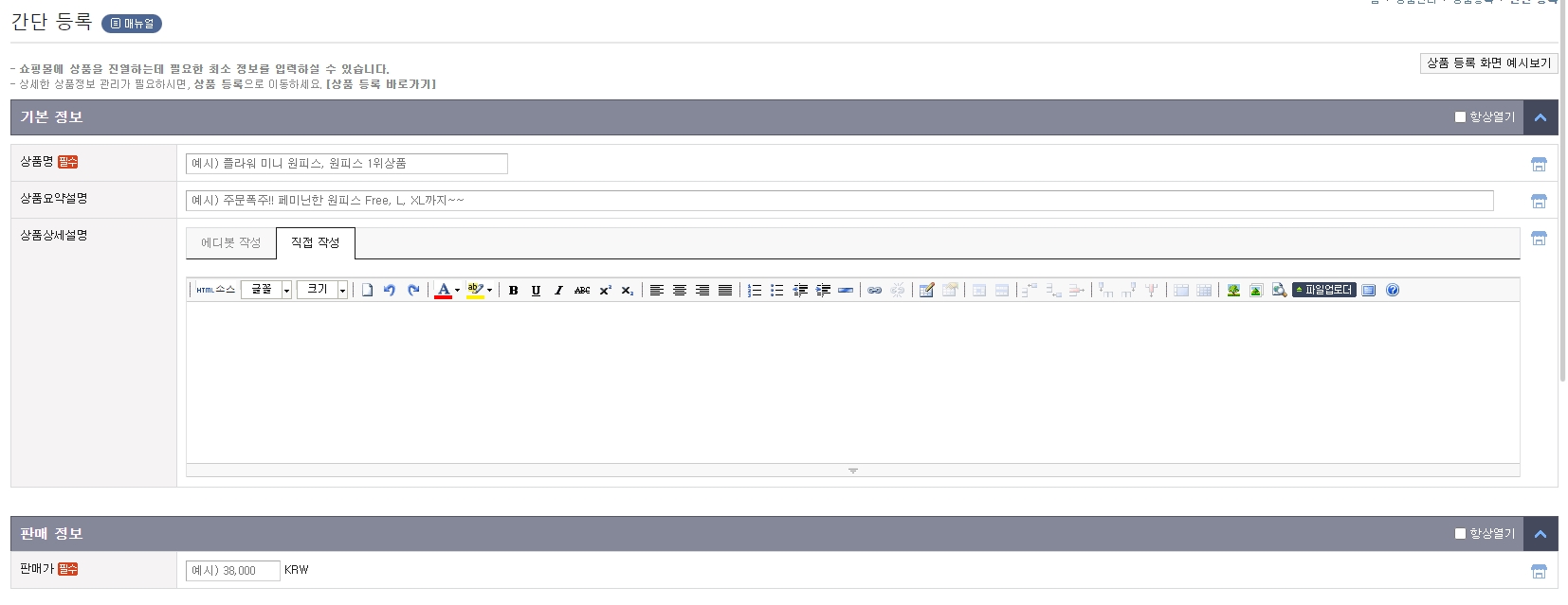 - 간단 등록으로 들어오면 우선 기본정보에서 상품명/상품요약설명/상품상세설명 입력란이 나옵니다.