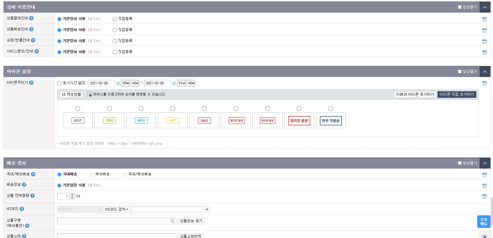 - 상세 이용안내와 아이콘 설정 배송 정보등을 입력해주세요.