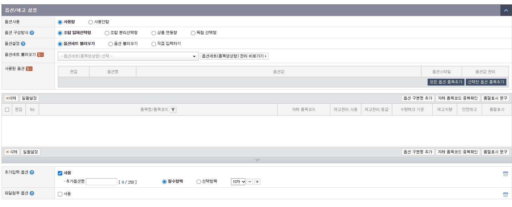 - 옵션/재고 설정에서 옵션이 있을 경우 사용함으로 체크하여 옵션을 입력해주세요.