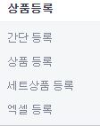 - 상품관리를 클릭하면 나오는 화면에서 왼쪽 카테고리중 상품등록과 관련된 카테고리는 간단등록/상품등록/세트상품등록/엑셀등록이 있는데요.
