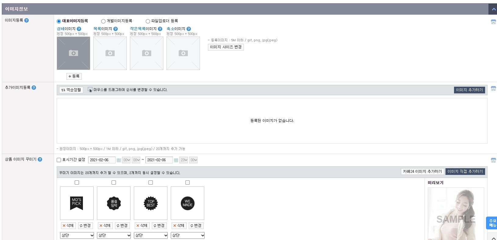 - 대표이미지를 클릭하고 썸네일을 업로드하면 상세/목록/작은목록/축소이미지가 각각의 사이즈에 맞게 자동 입력됩니다.