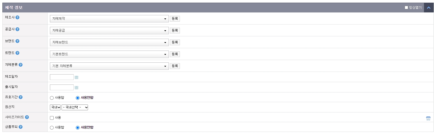 - 제작 정보에서 제조사, 공급사, 브랜드, 원산지등을 입력해주세요. 필수 사항이 아니므로 필요에 따라 입력하시면 됩니다.