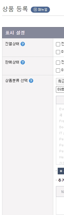 - 표시설정에서 진열상태와 판매상태를 각각 진열함, 판매함으로 체크해주시고 상품분류선택에서 카테고리를 선택해주세요.
