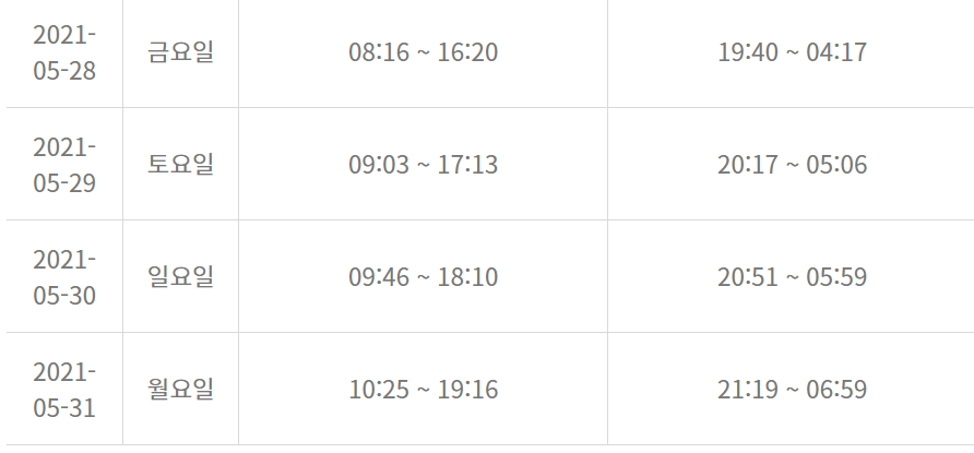 2021년 5월 물때 시간표를 아래에 첨부할게요. 오늘 날짜(5월 10일)를 기준으로 보면 새벽 5시 51분에서 낮 2시 36분에 1차로 통행이 가능하고, 그다음 3시 45분에서 새벽 2시 49분까지 2차로 통행이 가능합니다. 통행 가능 시간외에는 섬 입구를 닫아둡니다. 날짜에 따라 통행 가능 시간이 다 달라지니 미리 꼭 확인하고 가시는 게 좋아요. 그리고 대부분 차로 들어가시지만 가끔 걸어서 들어가는 분들도 있는데 그것도 시간만 넉넉하게 잘 맞추신다면 낭만 있고 추억이 될 것 같아요.